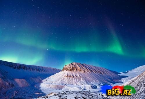 Şpitsbergen adasında gecə şimal şəfəqi.