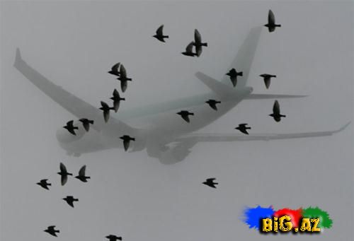 Quşlar uçan təyyarənin fonunda tutqun səmada uçurlar. Dublin, İrlandiya.