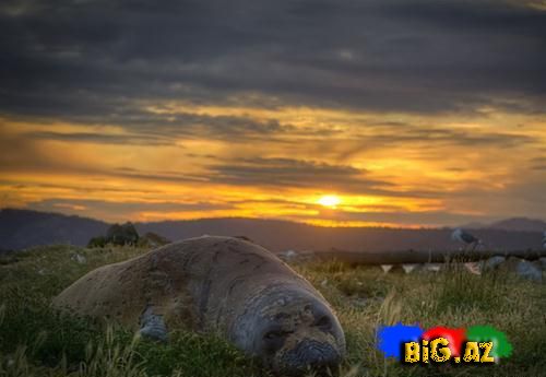 Dəniz fili qürubun vaxtı ot üzərində dincəlir. Britaniya Kolumbiyasında Race Rocks qoruğu, Kanada.